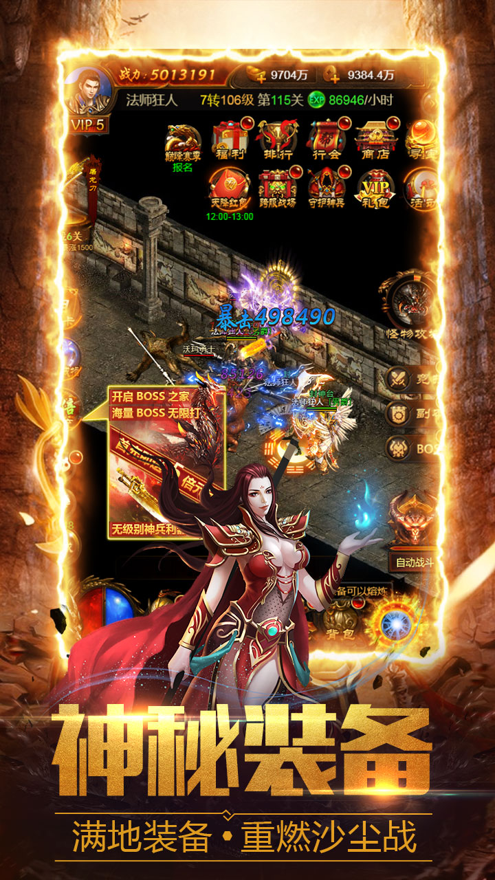 《赤焰号角》是一款以H5为主打的挂机类传奇游戏,每日免费送充值,不用花一分钱,即可获取满级VIP。 在游戏中你可以分别扮演战、法、道三个不同的角色在进行战斗,炫酷的装备和炫丽的翅膀特效会让让你有一种身临其境的感觉; 同时游戏采用放置式的玩法,能让你在百忙之中也可以一尝超爽的PK快感 细腻的游戏界面给你带来清晰真实的游戏体验,而且不仅配置了闯关,天梯塔等传统玩法,还新增了神装打造、装备精炼、战纹等功能让玩家更多方位的体验一个不一样的传奇世界